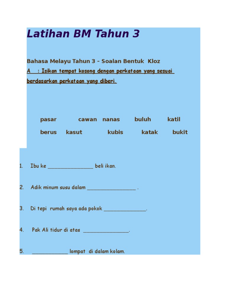 Soalan latihan tahun 1 hingga 5. Ujian 1 bm pem tahun 3. Isikan tempat kosong dengan perkataan yang sesuai berdasarkan perkataan yang diberi. Soalan tahun 6 sinonim (3). Contoh soalan percubaan sains pt3.