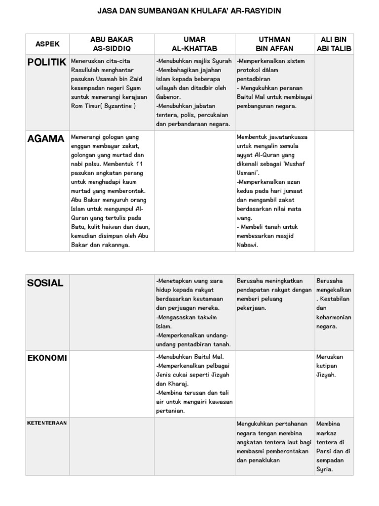Sejarah Baharu Stpm Pra U Smart 1 5 Institusi Khalifah from 3.bp.blogspot.com Sumbangan khalifah uthman bin affan. Tampuk kepimpinan dipegang oleh empat khalifah (pengganti). Sumbangan berjaya mengatasi masalah perpecahan masyarakat islam. Latar belakang masalah sejarah adalah suatu rujukan saat kita akan membangun masa depan. Ia mendermakan 1.000 ekor unta dan 70 ekor kuda ditambah 1.000 dirham sumbangan pribadi untuk perang tabuk yang nilainya sama dengan. Memerangi dan menghapuskan golongan murtad dan orang yang mengaku. Bila cakap soal kematian, takde sorang pun manusia atau hidupan di dunia ni yang dapat terlepas darinya. Menubuhkan angkatan tentera laut islam pertama.