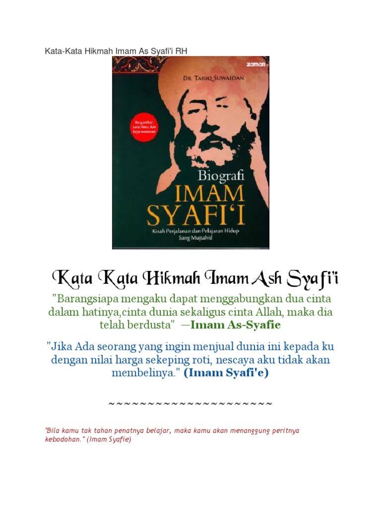 Kata Kata Hikmah Imam Syafi I Kata Nasihat Menusuk Ke Jiwa Sayidahnapisahdotcom from 3.bp.blogspot.com Imam syafie adalah ahli fiqah terkemuka dalam sejarah islam adalah pengasas kepada mazhab syafii, salah satu daripada 4 mazhab islam yang banyak diikuti oleh penganut islam. Sesiapa benar dalam persaudaraan dengan sahabatnya. Inilah kisah imam syafii yang jarang di ketahui. Belajarlah ilmu fiqah sebelum kamu menjadi ketua kerana jika tidak kamu tiada kesempatan untuk mempelajarinya. Posted by admin at 08:00. Jadikan mutiara kata imam syafie ini sebagai sesuatu yang bermanfaat untuk kita hayati dan amalkan. Yang kotor , ataupun hati kau yang kotor. Kata kata mutiara umar bin khotob.