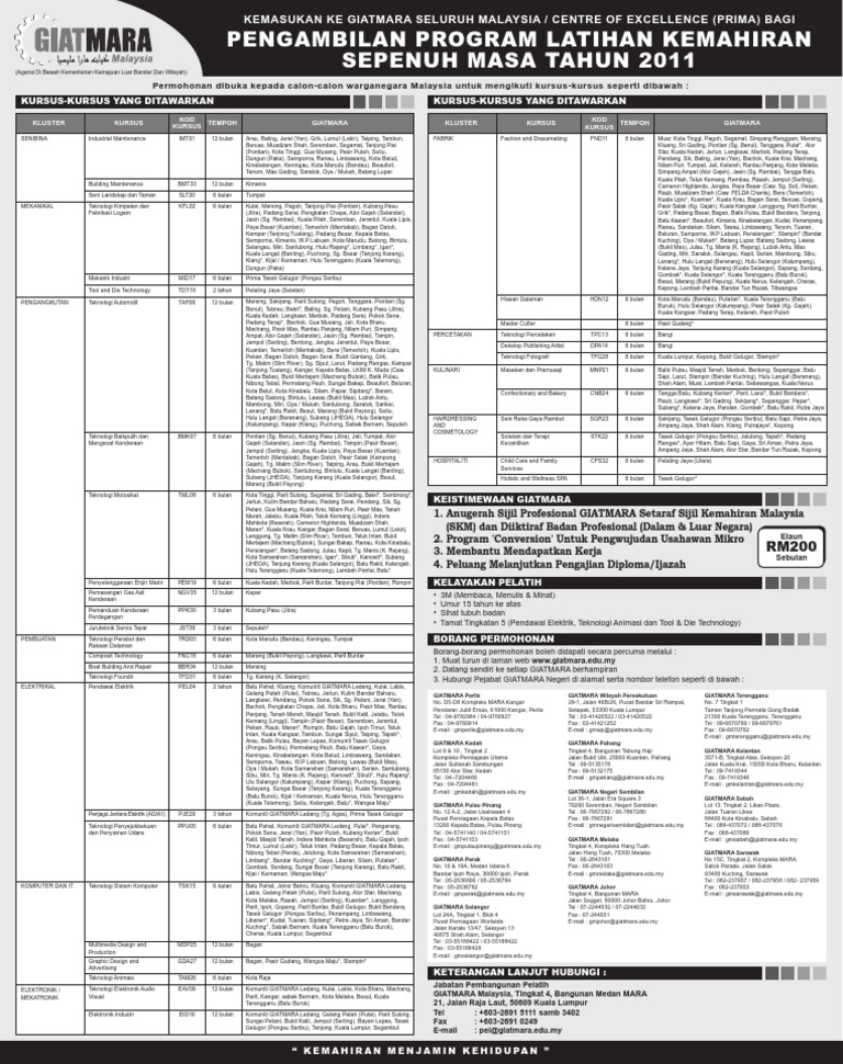 Jawatan Kosong Giatmara Jobs Hub from jobshub.info Kini, uitm mempunyai 35 cawangan di seluruh malaysia yang menawarkan. Pihak mara telah menetapkan beberapa syarat sebelum pemohon dibenarkan menyertai pusat pengajian kelolaan mara ini. Pengambilan giat mara 2018 kini dibuka. Syarat kemasukan ke ikm (institut kemahiran mara) dan kktm (kolej kemahiran tinggi mara) mengikut program. Permohonan kemasukan ke tingkatan empat maktab rendah sains mara. Tamat tingkatan 5 dan berumur 18 tahun ke atas adalah syarat tambahan untuk menduduki peperiksaan kompetenan suruhanjaya tenaga (st) bagi kursus pendawai elektrik & penjaga jentera elektrik. Mesti ada minat mendalam dengan kursus giat mara yang anda mohon. Free unlimited pdf search and download.