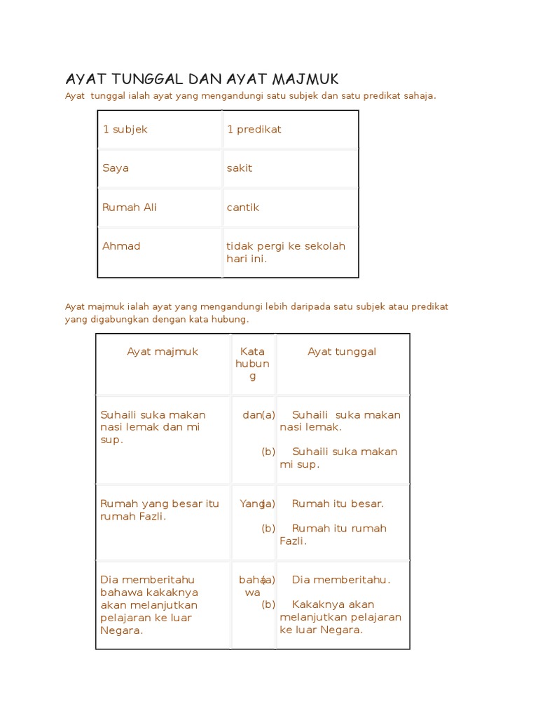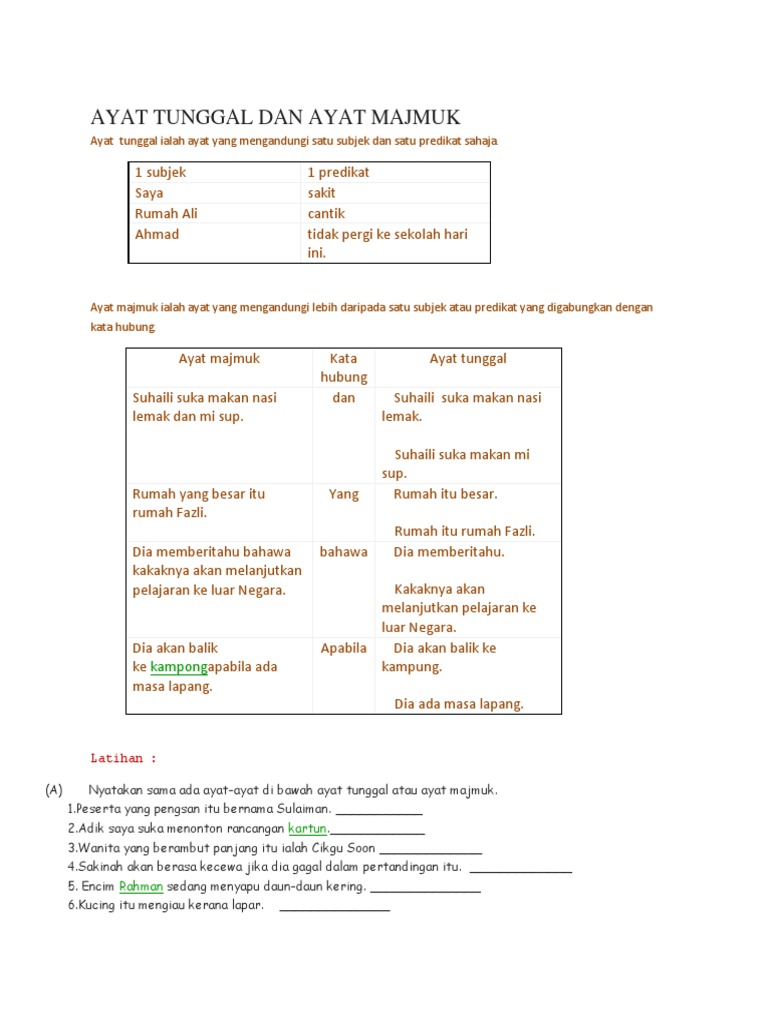 Ayat Tunggal Dan Ayat Majmuk Vrsta Grupe from az779572.vo.msecnd.net Semua penuntut universiti boleh menjadi ejen kepada kerajaan. Tidak pergi ke sekolah hari ini. Terima kasih cikgu saya dah faham apa itu ayat tunggal dan ayat majmuk. Dalam sebuah kalimat majemuk akan terdapat induk kalimat dan anak kalimat. Ayat tunggal ialah ayat yang mengandungi satu subjek dan satu predikat sahaja. Terdapat perbezaan antara ayat tunggal dan ayat majmuk. 3(b) cerakinkan setiap ayat majmuk di bawah kepada dua ayat tunggal. Cerakinkan ayat majmuk tersebut kepada tiga ayat tunggal tanpa mengubah maksud asalnya.